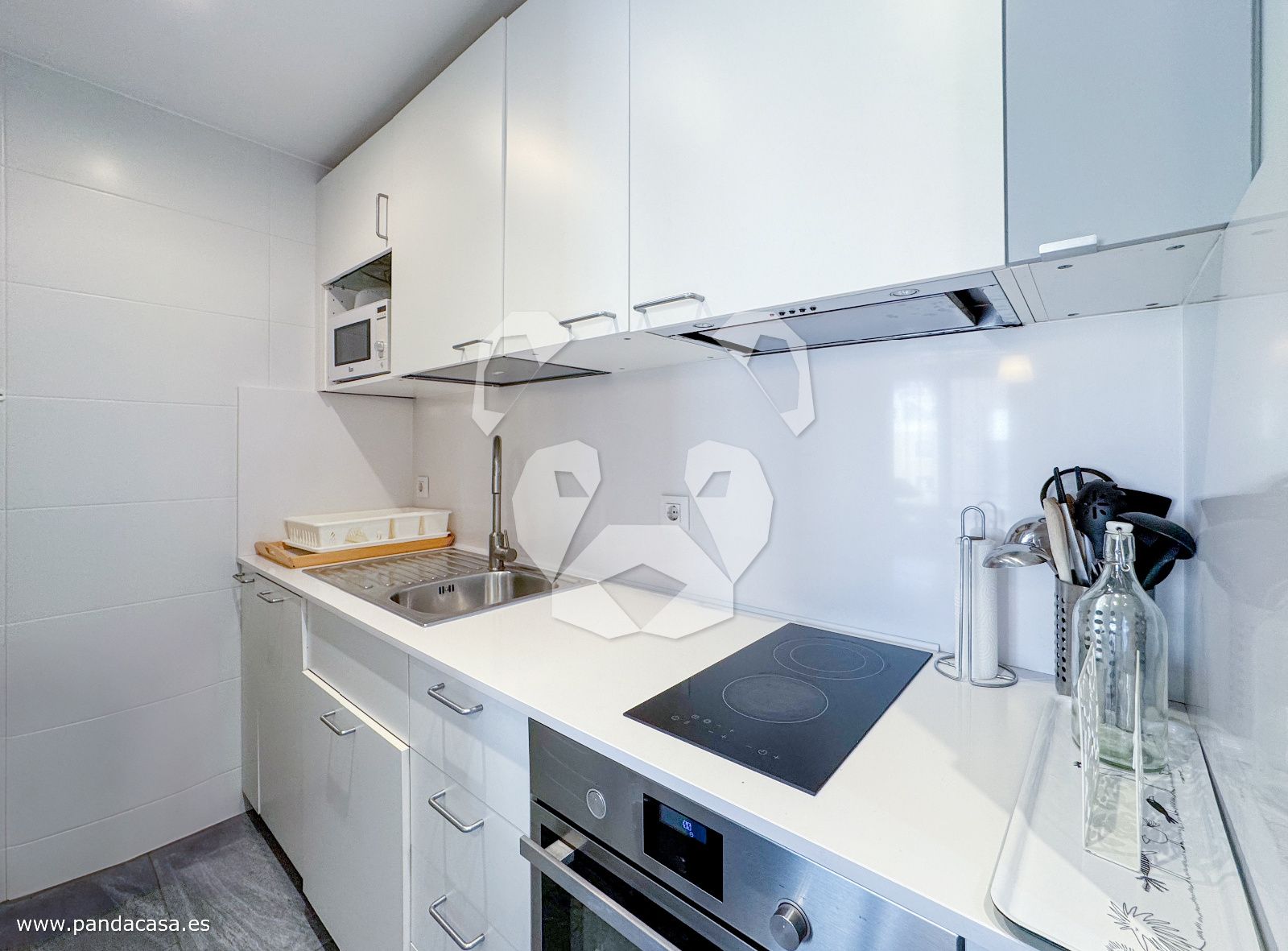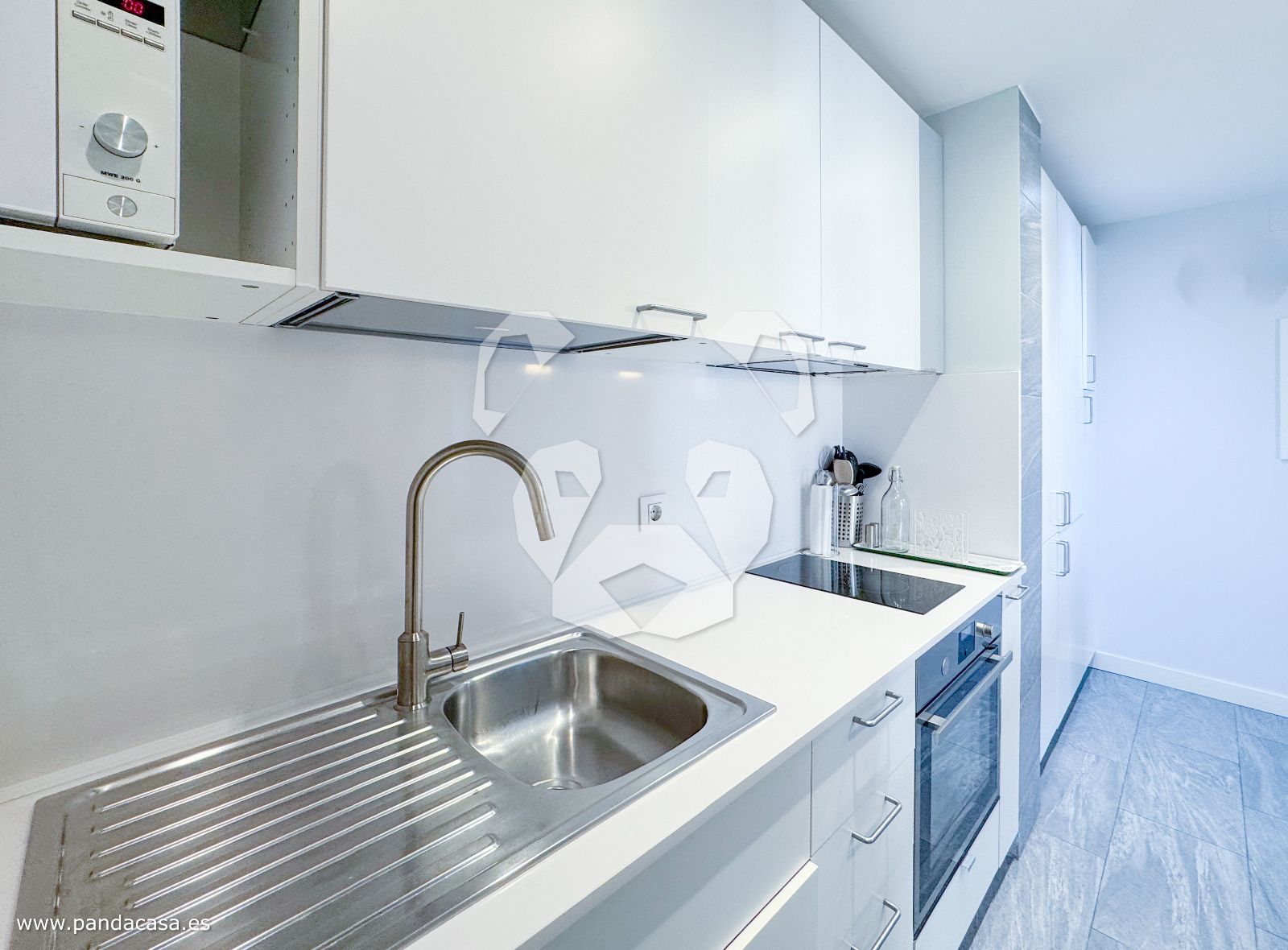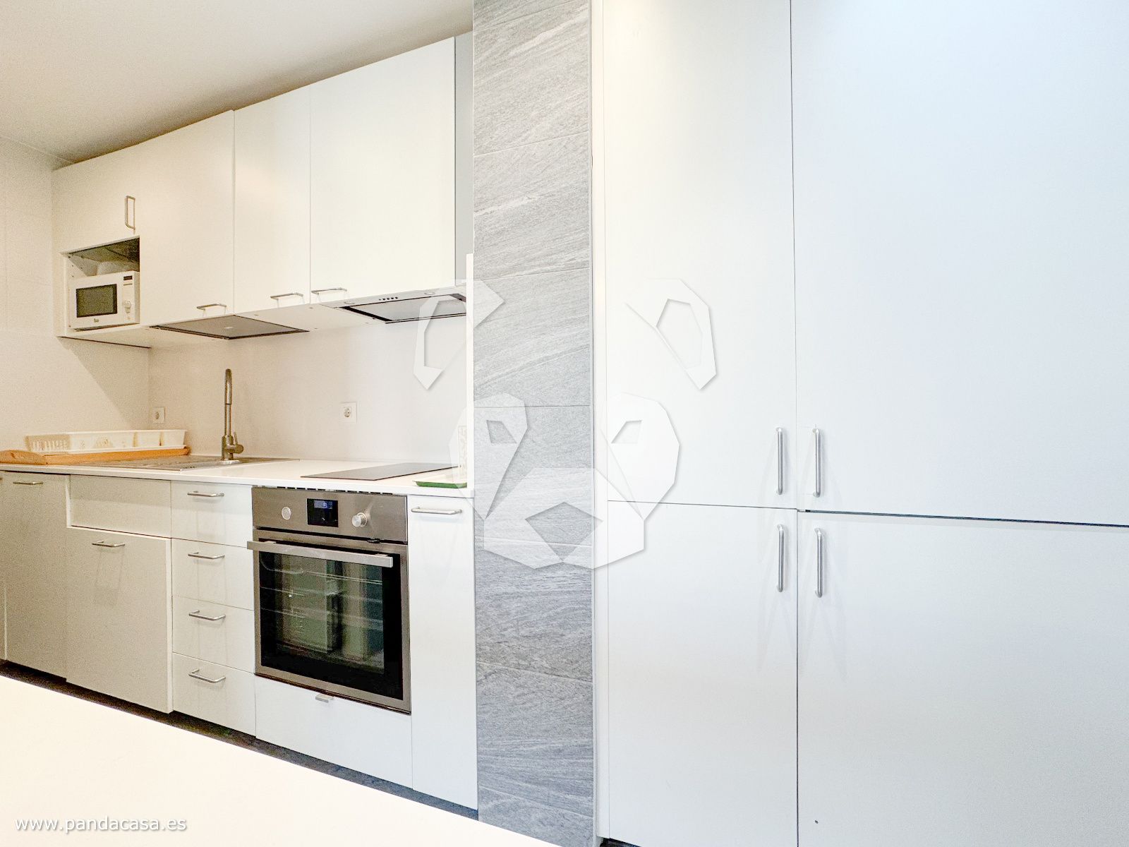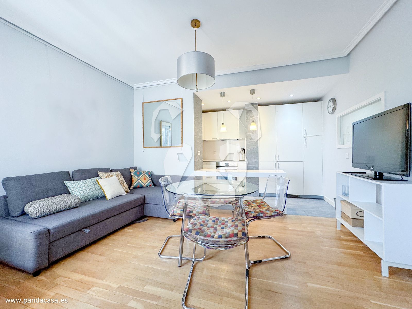 Este piso totalmente amueblado, listo para entrar a vivir, se encuentra en una quinta planta con orientación sur, lo que garantiza una excelente entrada de luz natural durante todo el día. Con una distribución inteligente, ofrece dos dormitorios; el principal es amplio, con una cómoda cama doble y gran capacidad de almacenaje. El segundo dormitorio, ideal para un niño o como oficina, cuenta con una cama individual y mesa de estudio. El salón, luminoso y acogedor, dispone de un sofá cama y televisión, perfecto para relajarse después de un día ajetreado. El comedor, con mesa de cristal para cuatro personas, es ideal para recibir a tus invitados. La cocina semi-integrada con barra, moderna y equipada con electrodomésticos de alta gama, incluye lavadora, lavavajillas, horno, placas de inducción, campana extractora, microondas, nevera y pequeños electrodomésticos, ofreciéndote todo lo necesario para disfrutar de la cocina en casa.