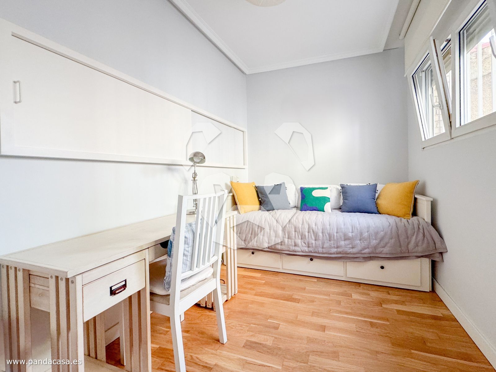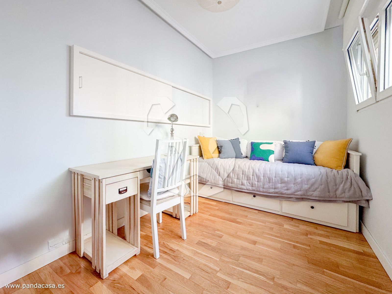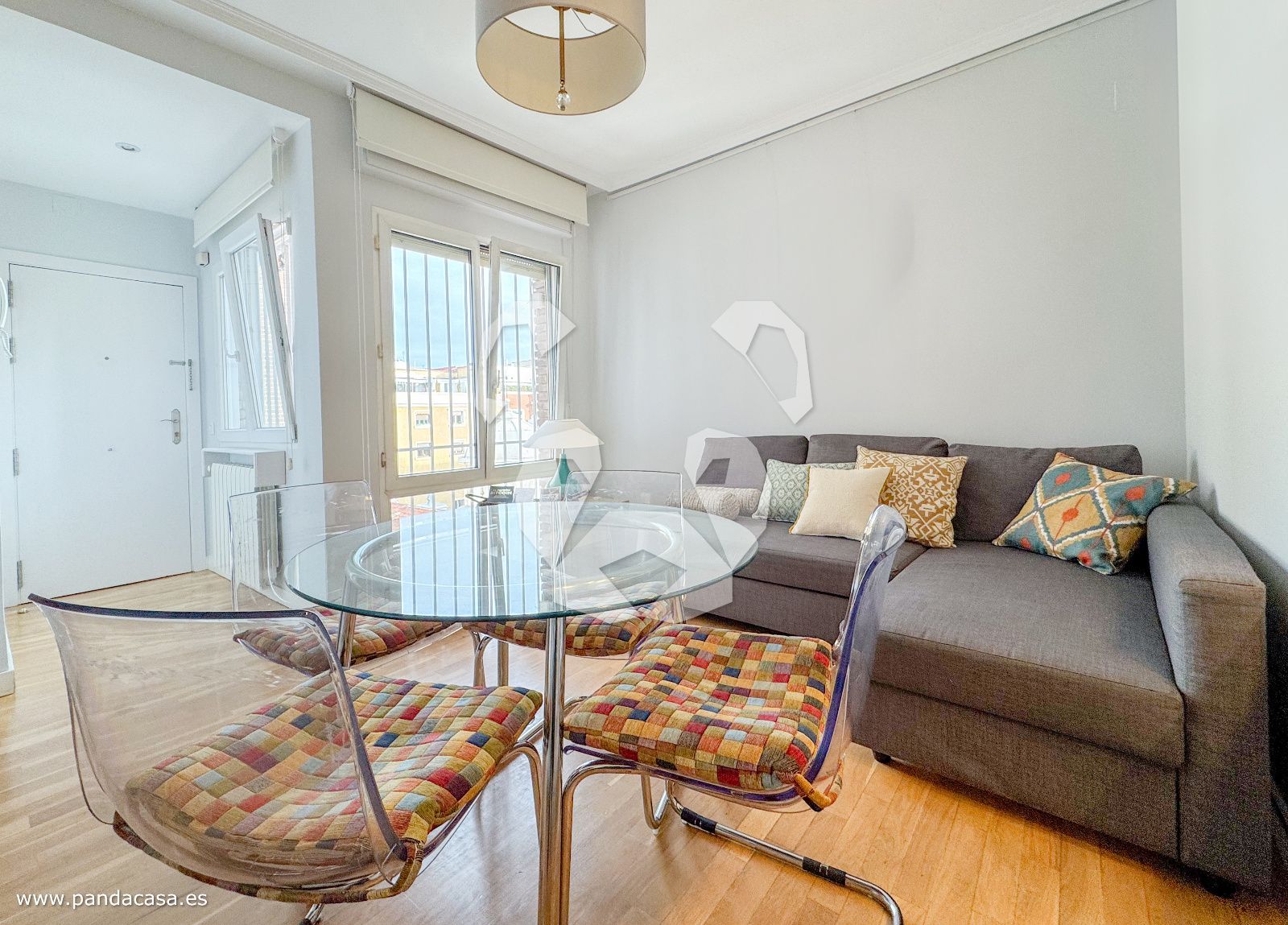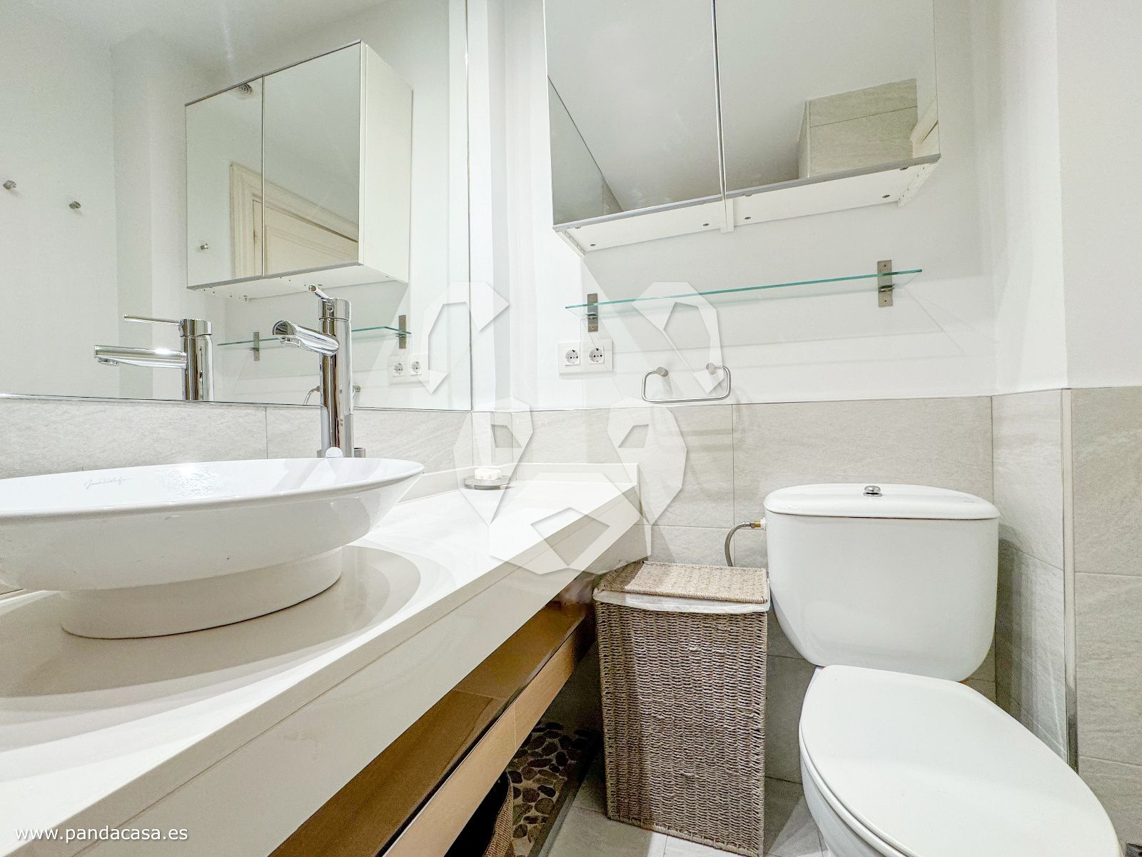 Este piso totalmente amueblado, listo para entrar a vivir, se encuentra en una quinta planta con orientación sur, lo que garantiza una excelente entrada de luz natural durante todo el día. Con una distribución inteligente, ofrece dos dormitorios; el principal es amplio, con una cómoda cama doble y gran capacidad de almacenaje. El segundo dormitorio, ideal para un niño o como oficina, cuenta con una cama individual y mesa de estudio. El salón, luminoso y acogedor, dispone de un sofá cama y televisión, perfecto para relajarse después de un día ajetreado. El comedor, con mesa de cristal para cuatro personas, es ideal para recibir a tus invitados. La cocina semi-integrada con barra, moderna y equipada con electrodomésticos de alta gama, incluye lavadora, lavavajillas, horno, placas de inducción, campana extractora, microondas, nevera y pequeños electrodomésticos, ofreciéndote todo lo necesario para disfrutar de la cocina en casa.