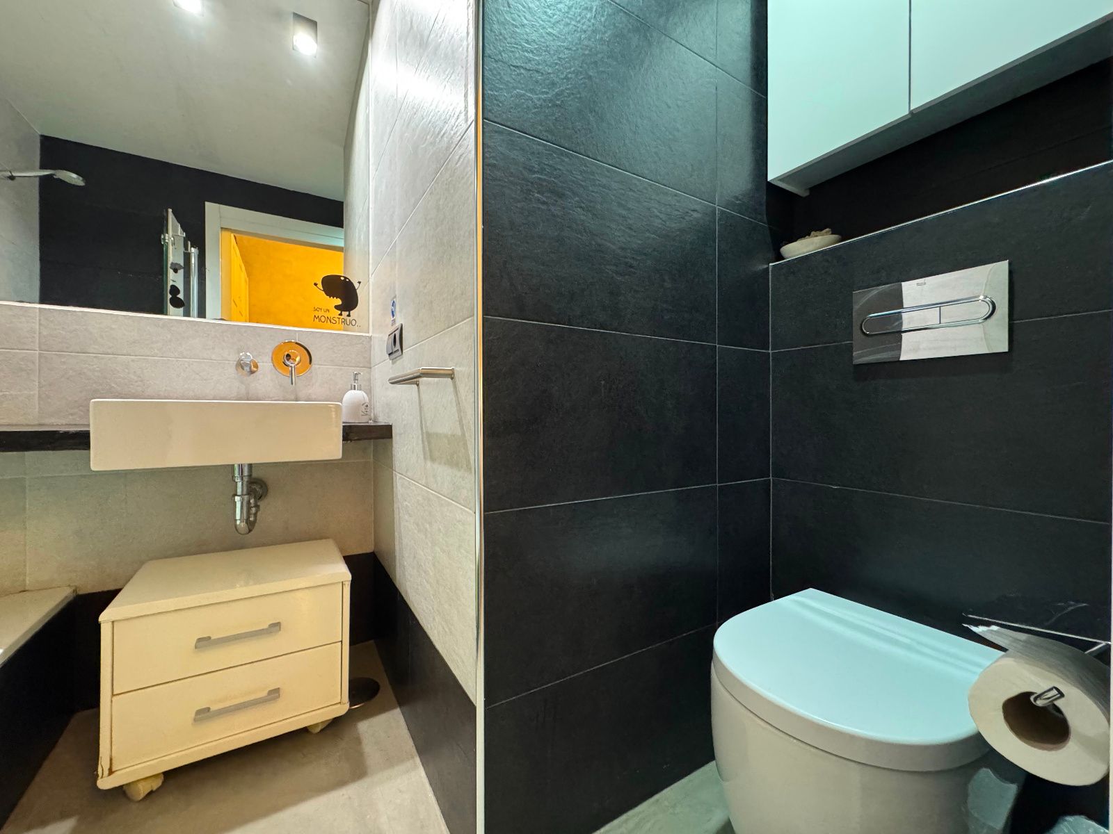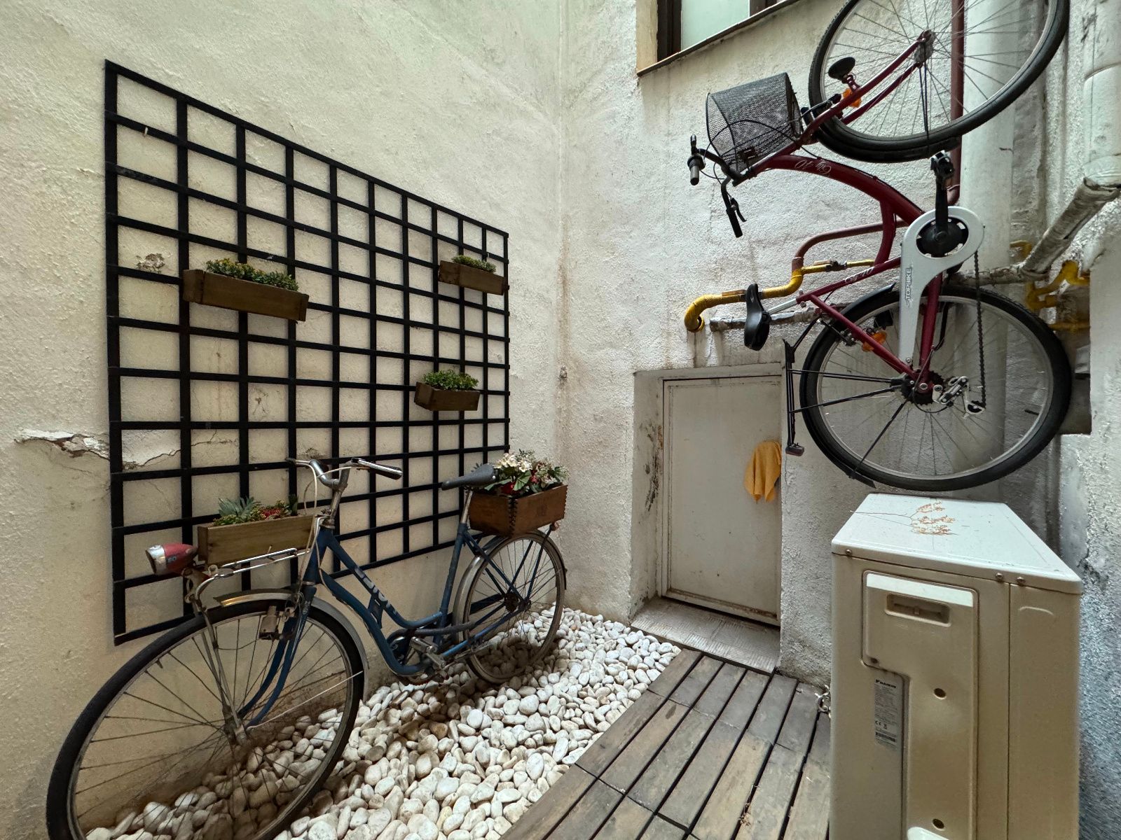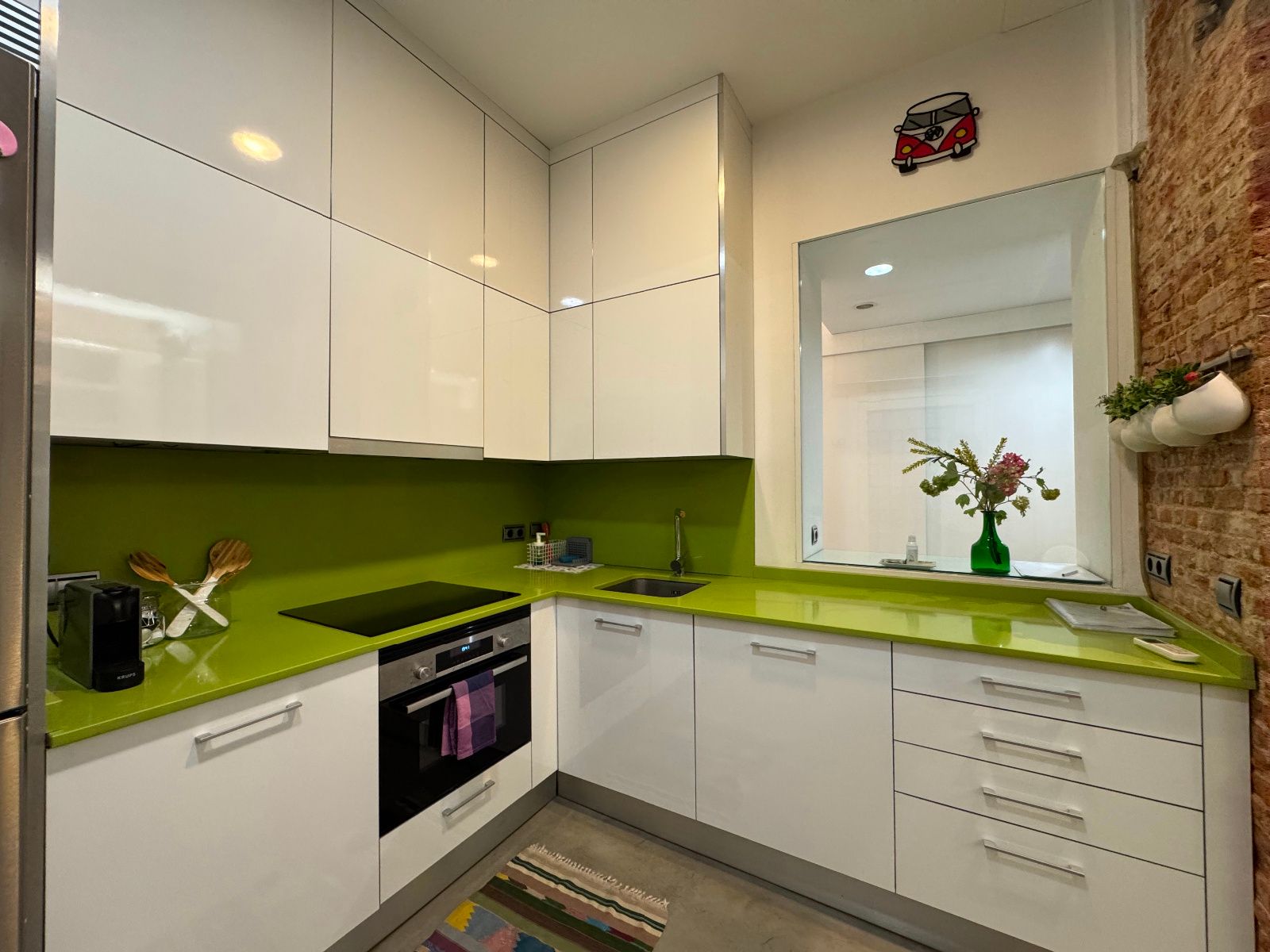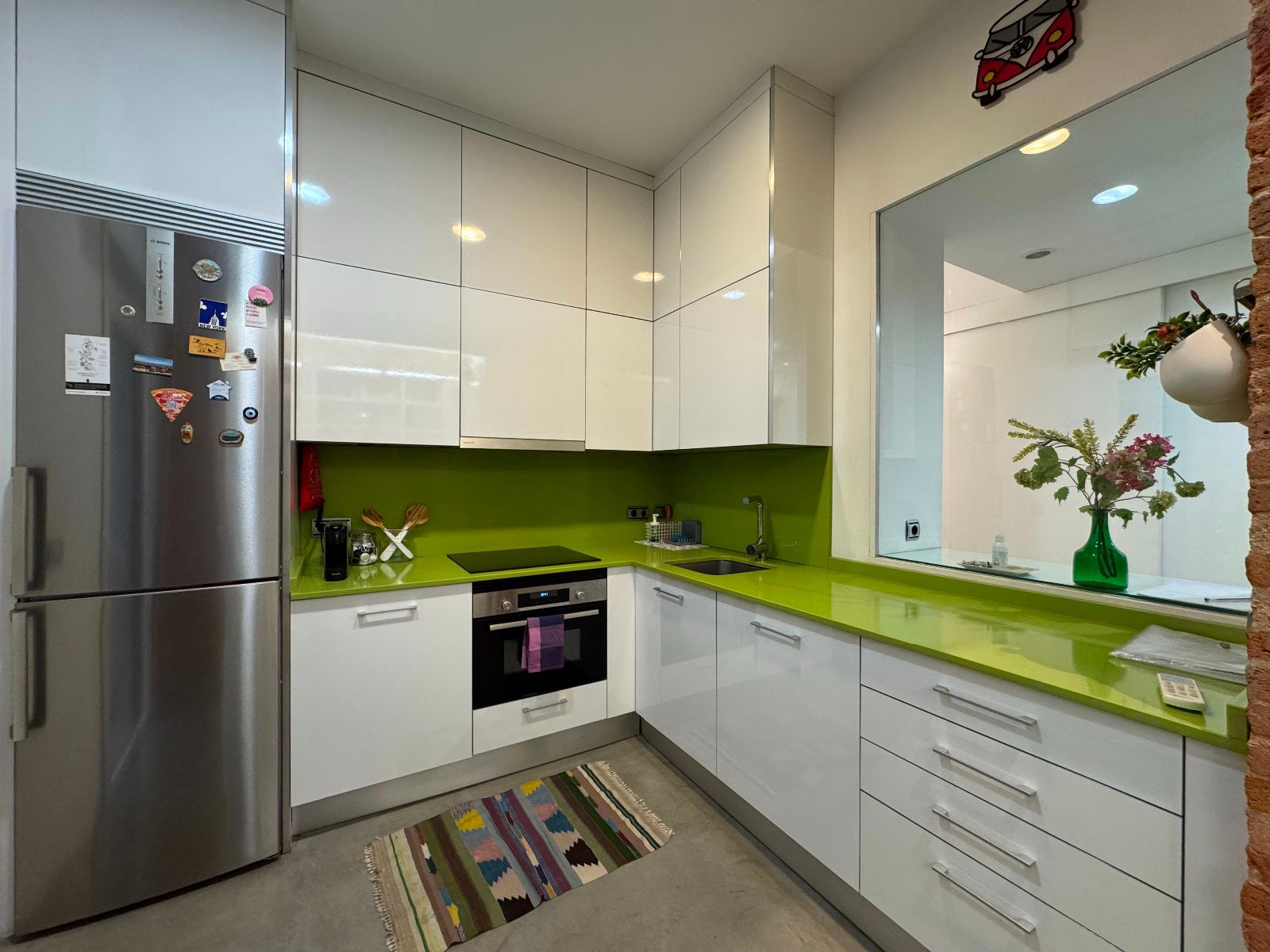 La vivienda, completamente amueblada y equipada, cuenta con dos habitaciones, salón-comedor, cocina independiente, baño completo, aseo y un patio interior de uso privativo. Se trata de un bajo muy luminoso gracias a sus grandes ventanales a distintos patios, que permiten la entrada de luz natural y una ventilación cruzada ideal. Todo el perímetro está perfectamente aislado, lo que garantiza tranquilidad en pleno centro. Reformada recientemente con un estilo moderno y cuidado, destaca por sus acabados en microcemento, paredes de ladrillo visto y cocina panelada con electrodomésticos de primeras marcas. Tiene calefacción por suelo radiante (gas natural) y aire acondicionado. El dormitorio principal incluye cama doble y baño en suite. El segundo dormitorio cuenta con cama nido (dos individuales) y armarios amplios. El salón es amplio, con sofá esquinero hecho a medida, estantería y espacio para relajarse o trabajar desde casa. La cocina está totalmente equipada y conecta con un acogedor patio interior. Se entrega con todo el menaje necesario para entrar a vivir.