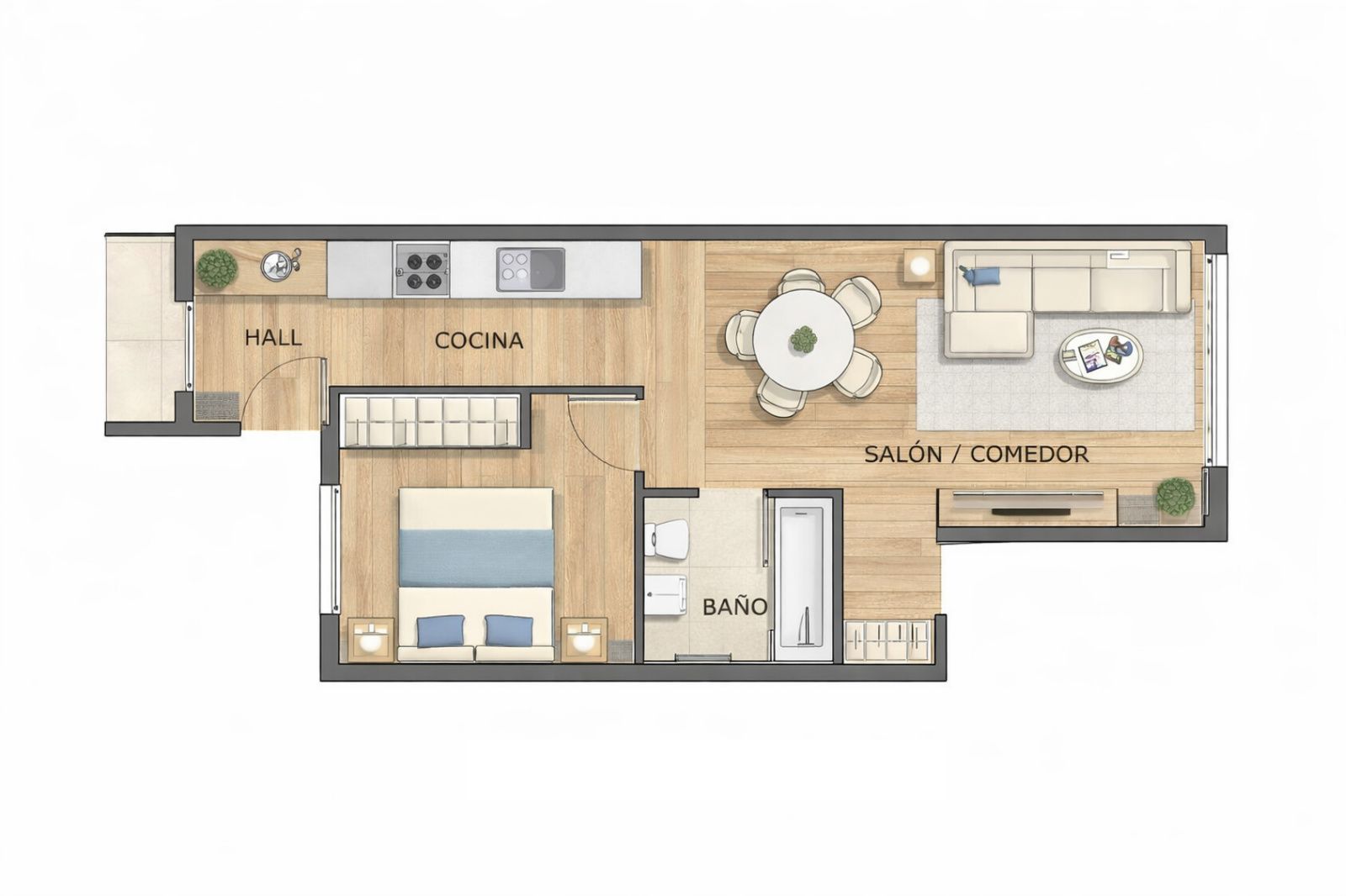 El piso se distribuye en un salón comedor cómodo y funcional, cocina equipada, un dormitorio y un baño completo. Dispone de aire acondicionado y calefacción, garantizando confort durante todo el año. Una opción práctica y bien resuelta, ideal para quienes buscan vivir en una de las zonas más consolidadas y mejor conectadas de Madrid. El edificio cuenta con ascensor y portero físico, ofreciendo comodidad y seguridad en el día a día.