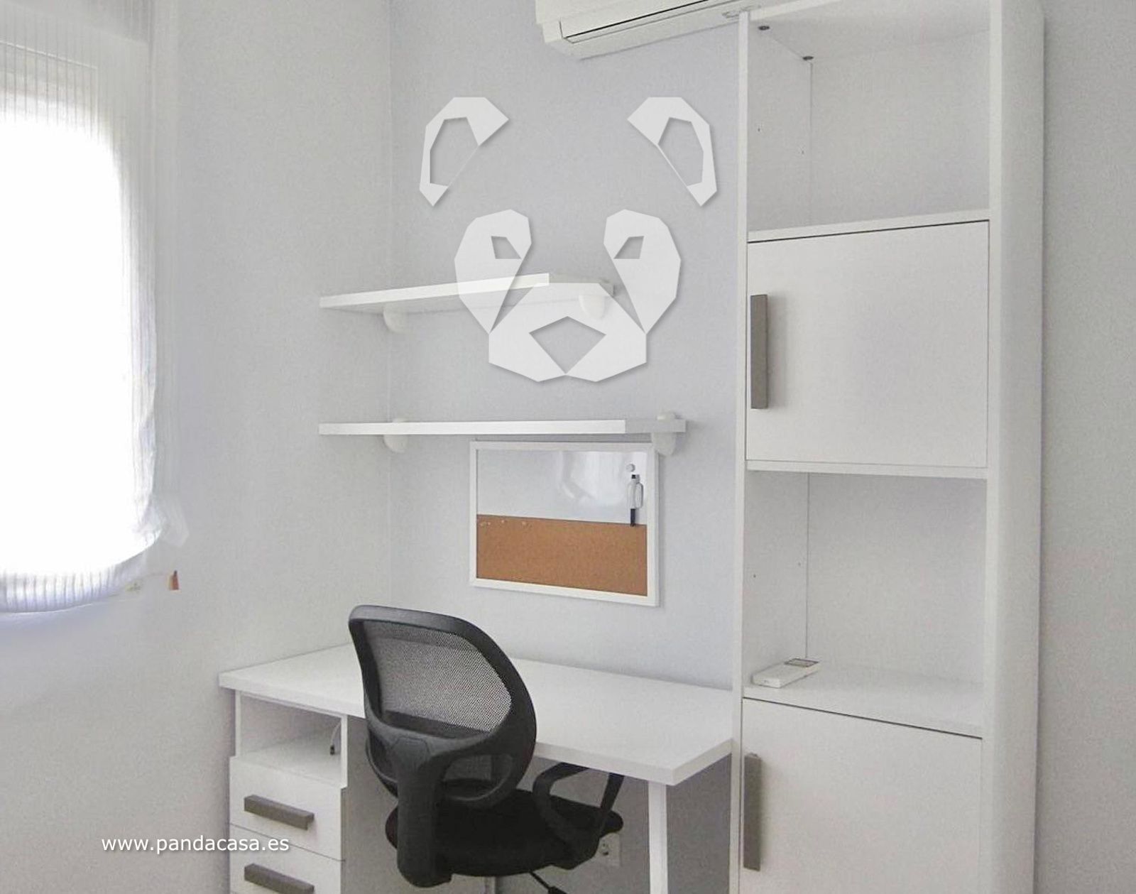 Cuenta con 2 dormitorios: el principal con cama de 135 cm y armario empotrado, y un segundo dormitorio con cama nido, armario y zona de trabajo. El salón se organiza en zona de estar y comedor, ofreciendo un espacio cómodo y bien aprovechado.
